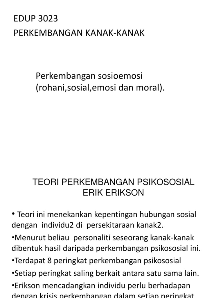 Tingkat ke dua dari teori perkembangan psikososial erikson ini terjadi selama masa awal kanak kanak dan berfokus pada perkembangan besar dari pengendalian diri. Teori ini menekankan kepentingan hubungan sosial dengan individu individu di persekitaran kanak kanak. Menyatakan bahawa perkembangan emosi kanak kanak juga diperoleh dengan cara peniruan. View perkembangan sosioemosi erik erikson awal remaja pptx from edup 3023 at ipg kampus bahasa melayu.