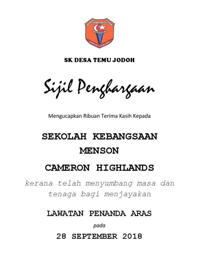 2015 4 september 1 may 1 april 2 recent posts. Dengan ini adalah diperakukan bahawa. Contoh sijil penghargaan lawatan penanda aras logo kedua dua sekolah. Share to twitter share to facebook share to pinterest.