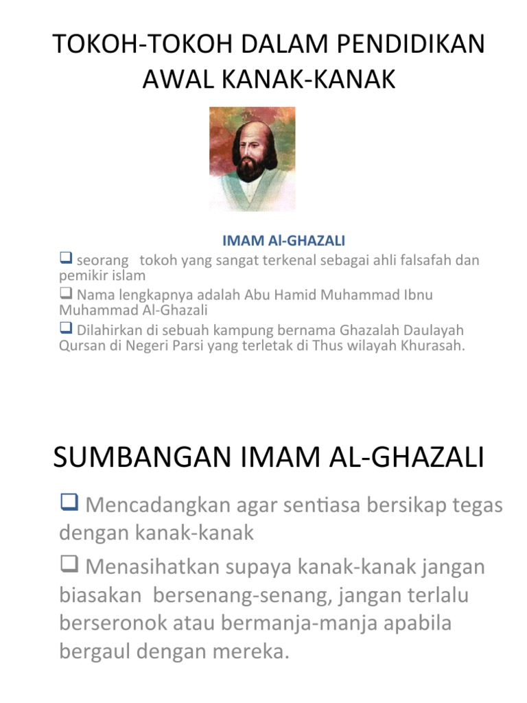 Sumbangan imam al ghazali dalam pendidikan awal kanak kanak. Pendidikan akhlak anak menurut imam al ghazali studi analisis dari perspektif teori reward dan punishment latar belakang masalah abu hamid al ghazali telah menduduki posisi yang cukup tinggi di kalangan para pemikir muslim dan para penganjur pendidikan islam bagi anak di mana ia dipandang seabagai salah satu tokoh islam yang menonjol dan mempunyai pengaruh besar dalam dunia. Dalam masa ini beliau belajar tasawwuf daripada yusuf an nasaj seorang sufi terkenal. Al ghazali mula berminat mengkaji bidang pendidikan setelah berguru dengan ali bin ahmad al radzikani abu nashr al ismaili dan imam al haramain abi al maali al juwairi. Pendapat ini dipersetujui oleh pendidik moden masakini.