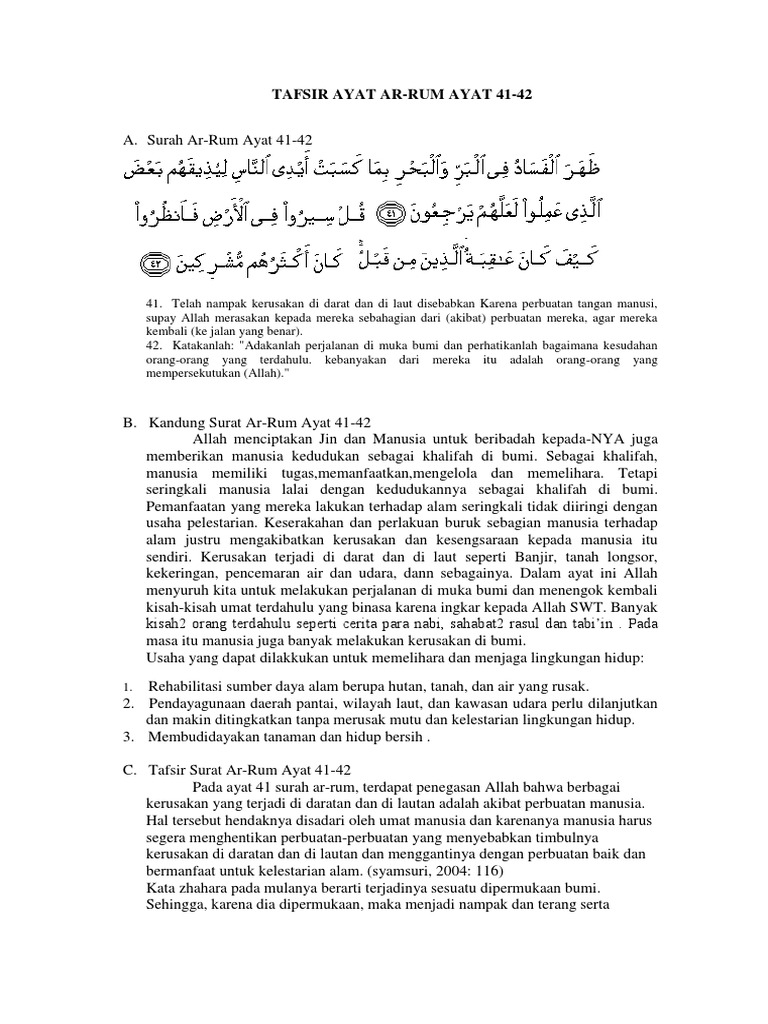 41 42 serta perilaku yang mencerminkan pemahaman terhadap surah ar rum ayat 41 42 ayat 41 allah swt menciptakan alam semesta ini untuk manusia dan manusia diciptakan oleh allah sebagai khalifah pemimpian dibumi ini namun manusia kadang yang membuat kerusakan tetapi ia tidak sadar. Abul aliyah mengatakan bahwa barang siapa yang berbuat durhaka kepada allah di bumi berarti dia telah berbuat kerusakan di bumi karena terpeliharanya kelestarian bumi dan langit adalah dengan ketaatan. Ar rum ayat 41 50 dan terjemah. ق ل س ير وا ف ي ال أ ر ض ف ان ظ ر وا ك ي ف ك ان ع اق ب ة ال ذ ين م ن ق ب ل ك ان أ ك ث ر ه م.