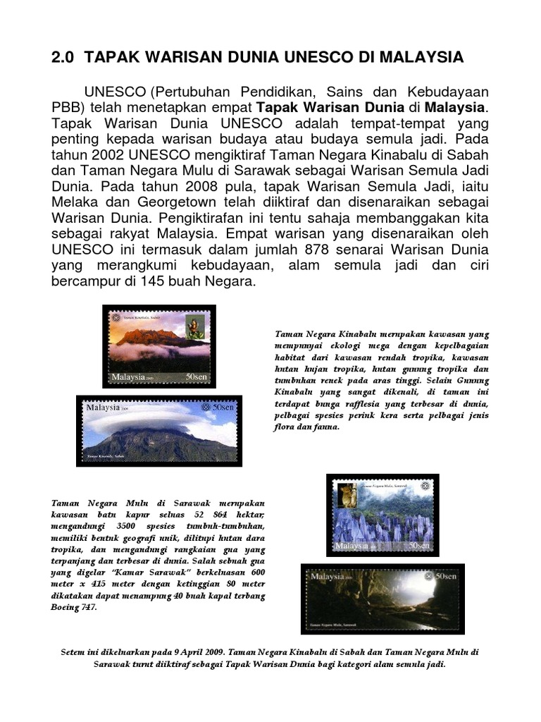 Tapak warisan dunia malaysia. Tapak warisan dunia atau dalam bahasa inggeris world heritage site merupakan status yang diberikan kepada lokasi lokasi dalam sesebuah negara yang dirasakan perlu dipulihara berikutan terdapat kepentingan elemen budaya sejarah sains dan elemen elemen lain yang dirasakan perlu dipulihara. Terletak di sebelah timur negeri sarawak gunung mulu ini mencapai ketinggian sehingga 2376 meter dan dikatakan telah berusia lebih 1 5 juta tahun lamanya gunung mulu ini juga merupakan kawasan batu kapur yang mempunyai keluasan 52 864 hektar dengan 3 500 spesis tumbuhan. Matta cadang lanjut moratorium sehingga jun 2021. Sedar atau tidak malaysia kini mempunyai empat tapak warisan dunia yang diiktiraf oleh pertubuhan pelajaran sains dan kebudayaan bangsa bangsa bersatu unesco.