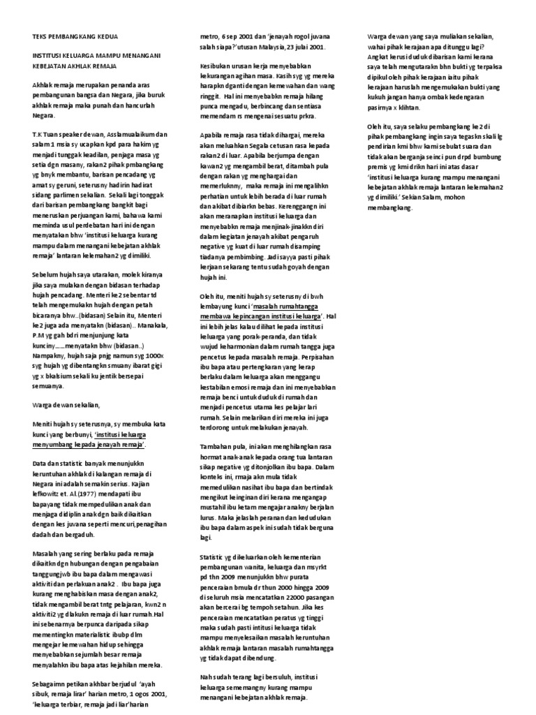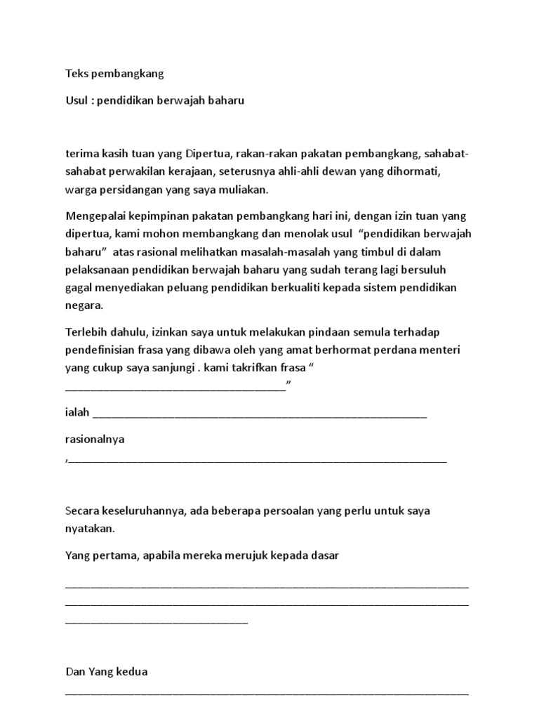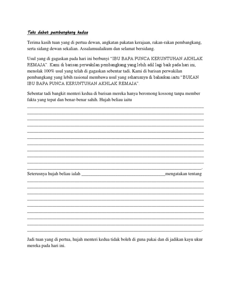 Assalamualaikum teks untuk ketua pembangkang ada x. Di sini saya sertakan teks bahas ala parlimen yang telah saya gunakan pada tahun 2010 ketika bertanding melawan smk pulau indah. Seterusnya hujah saya akan disambung oleh rakan pembangkang kedua yang ternyata tidak kurang mantap hujahnya. Rangka karangan kata alu aluan pendahuluan.