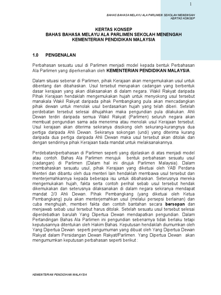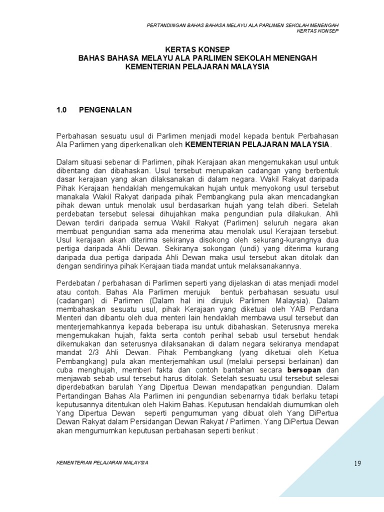 Program bengkel bahas bahasa melayu ala parlimen sekolah sekolah menengah negeri kedah tahun 2013 sukacita dimaklumkan bahawa pihak konsultan pengucapan awam minda intelek global dan adc enterprise dengan kerjasama jabatan pendidikan negeri kedah darul aman akan mengelolakan program bengkel ini pada ketetapan seperti berikut. Harmi 012 2154945 whatsapp digalakkan. Kertas konsep bahas bahasa melayu ala parlimen sekolah menengah kementerian pelajaran malaysia. Untuk tempahan atau maklumat lanjut sila hubungi en.