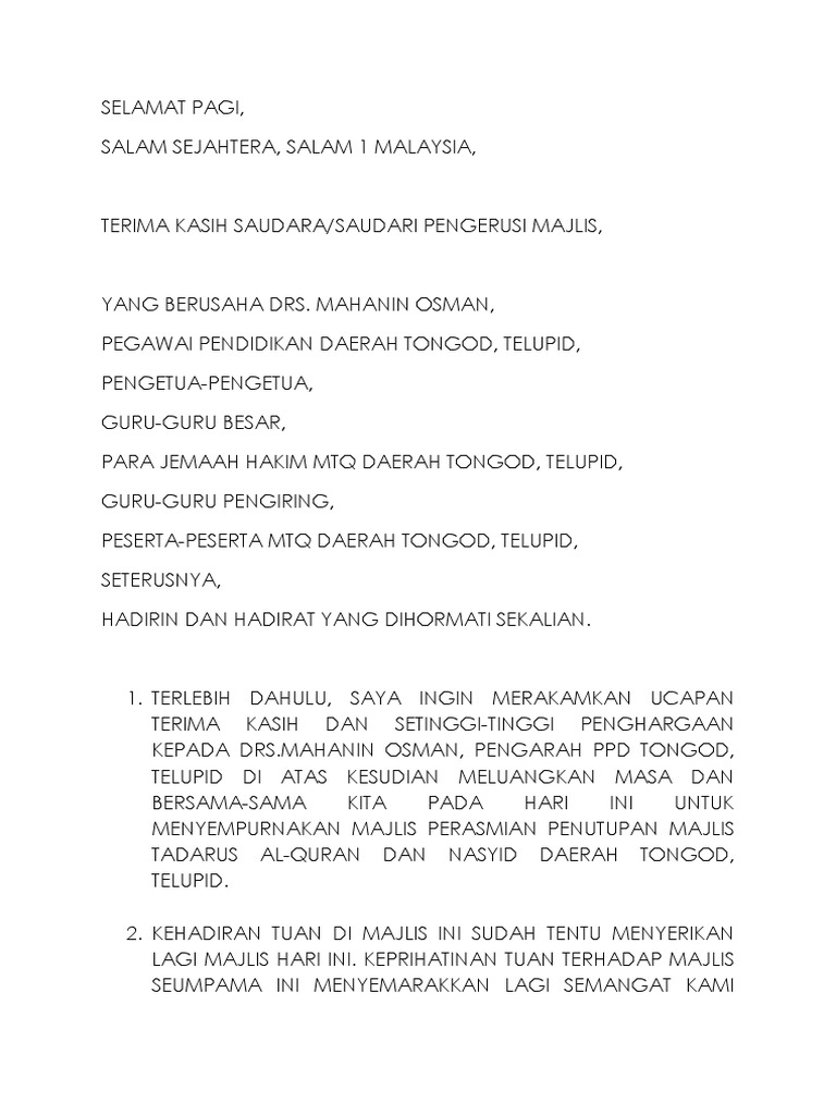 Teks ucapan perasmian penutup mtq. Teks ucapan sempena majlis perasmian penutup kursus kredibiliti smk elopura 2 2015. Sebagai ucapan kata penutup. Teks ucapan sempena majlis penutup kursus protokol etiket sosial dan pengurusan majlis rasmi oleh tuan hj. Adnan bin ibon timbalan ketua pengarah pengurusan bahagian hal ehwal undang undang pada 23 februari 2011.