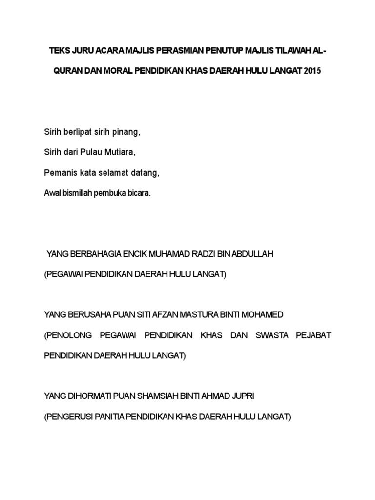 Teks pengacara majlis perasmian penutupan program 1. Hadirin dan hadirat yang dihormati sekalian. 1 teks pengacara majlis perasmian penutup bengkel kerjaya 2017 pengunguman menungumumkan ketibaan yang berbahagia dr abdullah bin yusoff timbalan pengarah ipg kampus kota bharu diiringi oleh dif dif jemputan berarak masuk ke dewan. Yang dihormati barisan panel hakim guru guru pengiring yang dikasihi peserta pertandingan majlis tilawah quran peringkat daerah klang bagi tahun 2014.