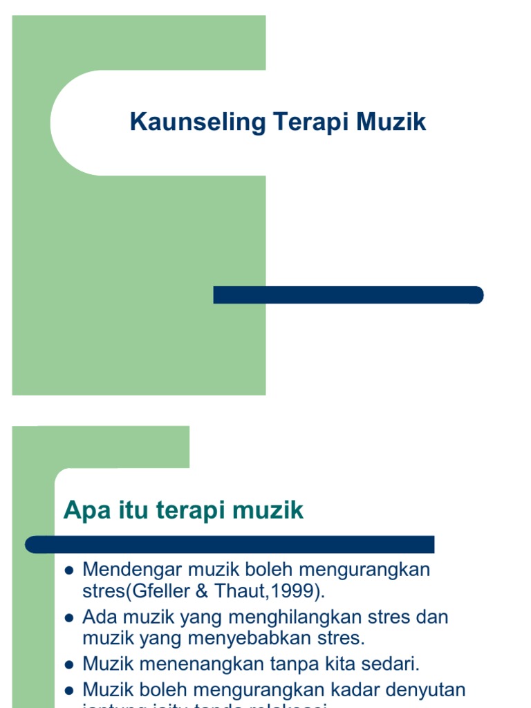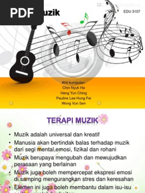 Terapi muzik dalam kaunseling pdf. Terapi muzik adalah alternatif dalam rawatan moden dan satu bidang profesional yang menggunakan muzik bertujuan untuk pemulihan pemeliharaan dan peningkatan taraf kesihatan mental serta fizikal. Terapi seni dalam kaunseling pelajar pintar dan berbakat rafidah kastawi noriah mohd ishak 147 166 stress and mental health problem on secondary school student in sabah balan rathakrishnan alfred chan 167 176 kecenderungan melayari internet dalam kalangan remaja india muslim di kuala lumpur razaleigh muhamat kawangit ahmad tarmizi talib. Terapi muzik yang digunakan dalam sesi kaunseling memainkan peranan yang penting dalam membantu seseorang klien meredakan keadaan yang mereka alami. Terdapat sekurang kurangnya lima orang sarjana greek yang mempunyai pandangan sendiri dalam hal berkaitan terapi muzik.