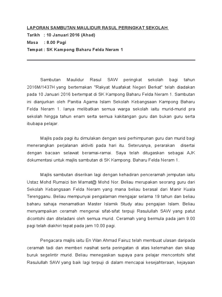 Tujuan sambutan maulidur rasul. Dan semua kisah dari rasul rasul kami ceritakan kepadamu ialah kisah kisah yang dengannya kami teguhkan hatimu surah hud ayat 120. Ianya merupkan hari cuti hari kelepasan am buat rakyat malaysia. Maulidur rasul ialah majlis memperingati keputeraan nabi muhammad sallallahu alaihi wasallam yang kebiasaannya disambut pada setiap 12 rabiulawal dengan mengadakan berbagai acara sambutan seperti perarakan ceramah dan berselawat bagi memuliakan junjungan besar umat islam dan sebagai tanda kecintaan kepada rasulullah sallallahu alaihi wasallam. Dari segi istilah maulid nab.
