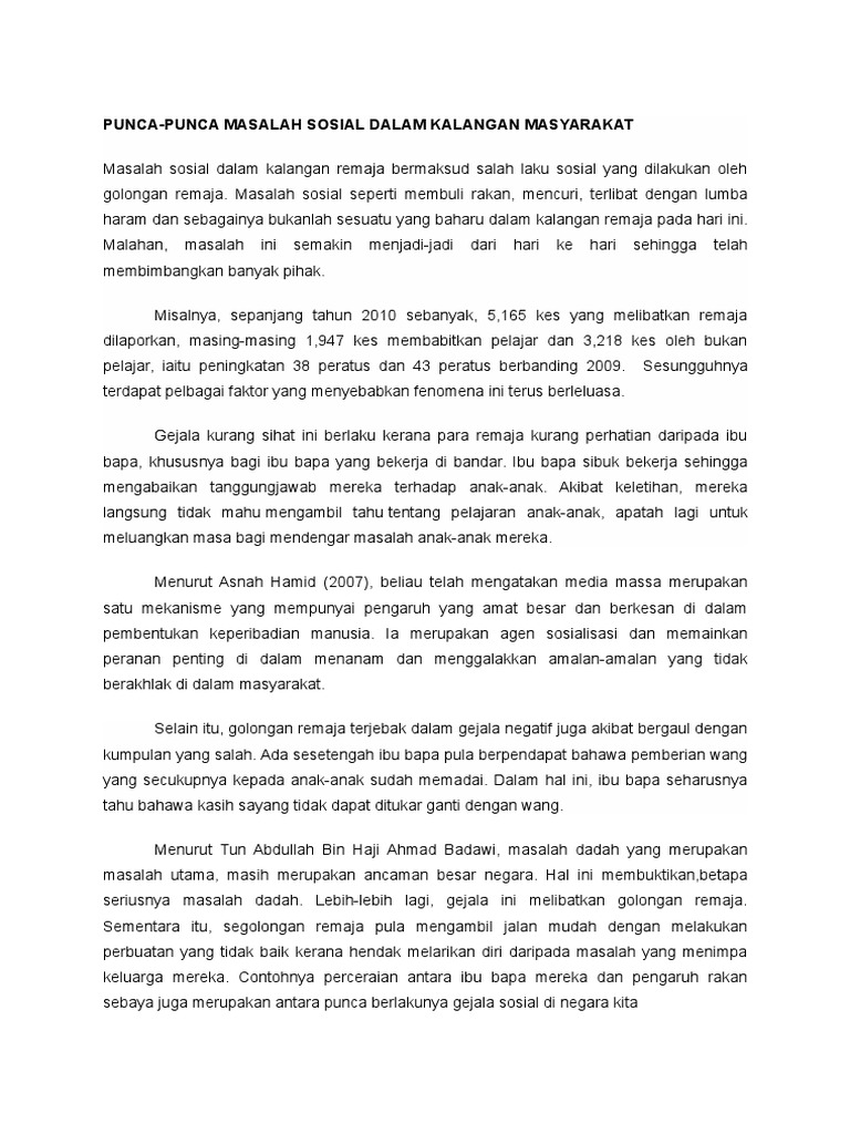 Terdapat beberapa masalah sosial ini terjadi kepada golongan remaja khususnya. Berdasarkan petikan tersebut tulis sebuah ringkasan tentang punca punca penyakit sosial dalam kalangan remaja. Maka kalau ditulis punca punca gejala sosial dalam kalangan remaja bermaksud punca punca petanda atau tanda tanda sosial dalam kalangan remaja. Pertengkaran ataupun perbalahan antara ibu bapa yang berlarutan memberi impak yang besar terhadap anaknya tanpa mereka sedari.